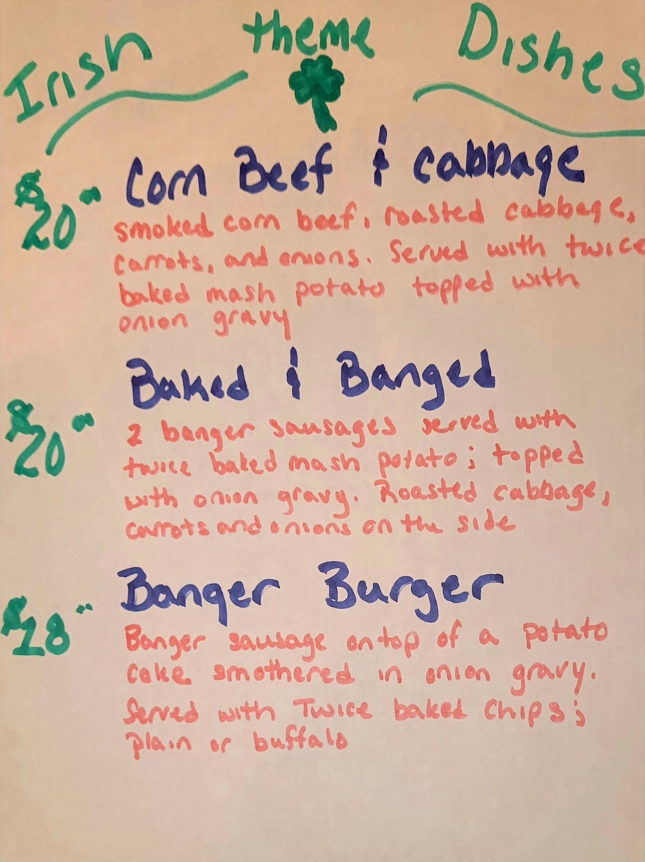 Irish Menu : Corn beef and Cabbage, Baked and Banged, and Banger Burger